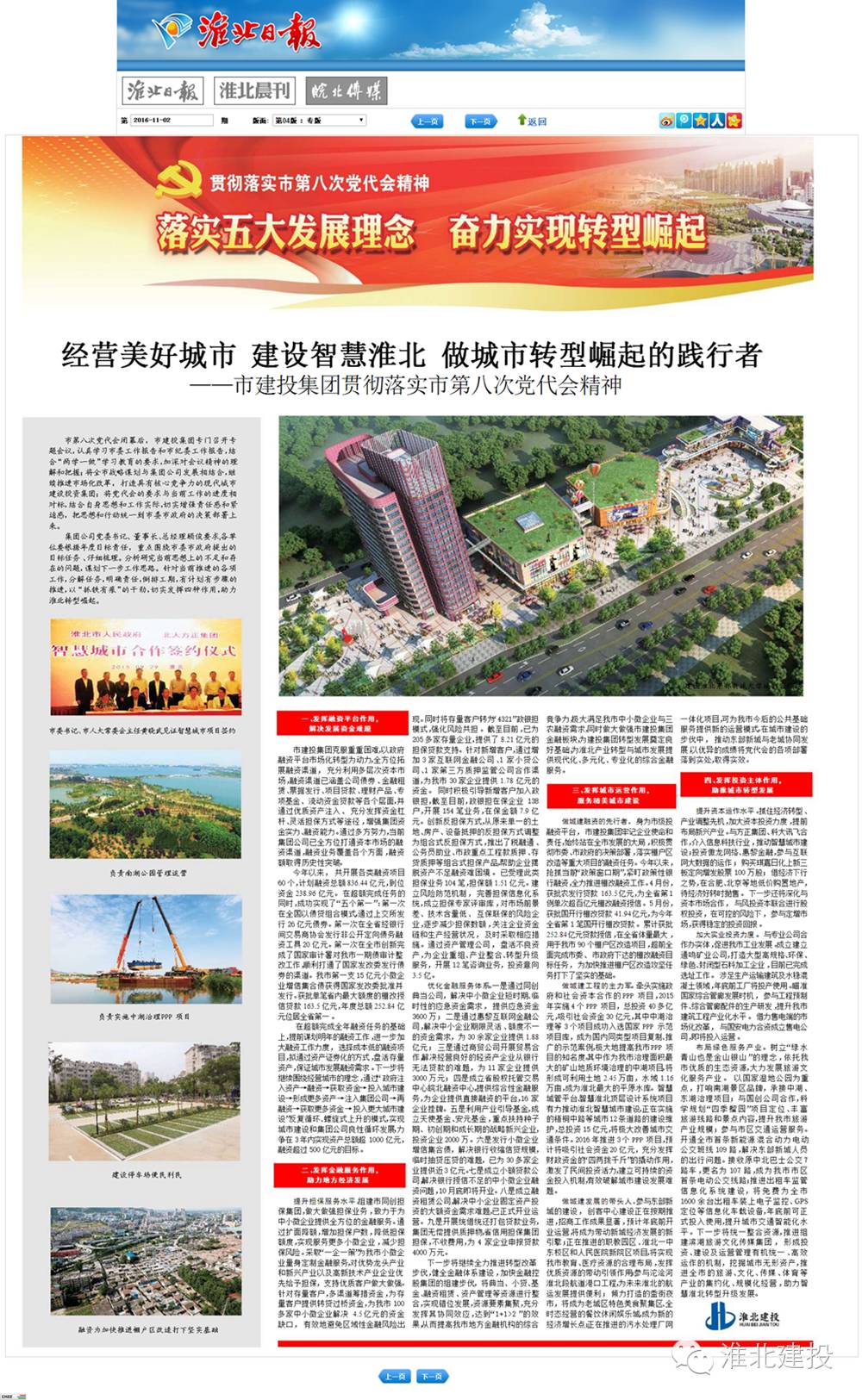 三是發(fā)揮城市運營作用,服務(wù)精美城市建設(shè)。始終站在全市發(fā)展的大局,貫徹市委、市政府的決策部署,落實棚戶區(qū)改造等重大項目的融資任務(wù),累計獲批252.84億元貸款授信,在全省體量最大。牽頭實施政府和社會資本合作的PPP項目,中湖治理等3個項目成功入選國家PPP示范項目庫。參與東部新城的建設(shè),建設(shè)大學(xué)城創(chuàng)客驛站,推進職教園區(qū)、淮北一中東校區(qū)和人民醫(yī)院新院區(qū)項目,傾力打造老城區(qū)盉街夜市餐飲休閑娛樂城,推動?xùn)|部新城與老城協(xié)同發(fā)展,以優(yōu)異的成績將黨代會的各項部署落到實處,取得實效。