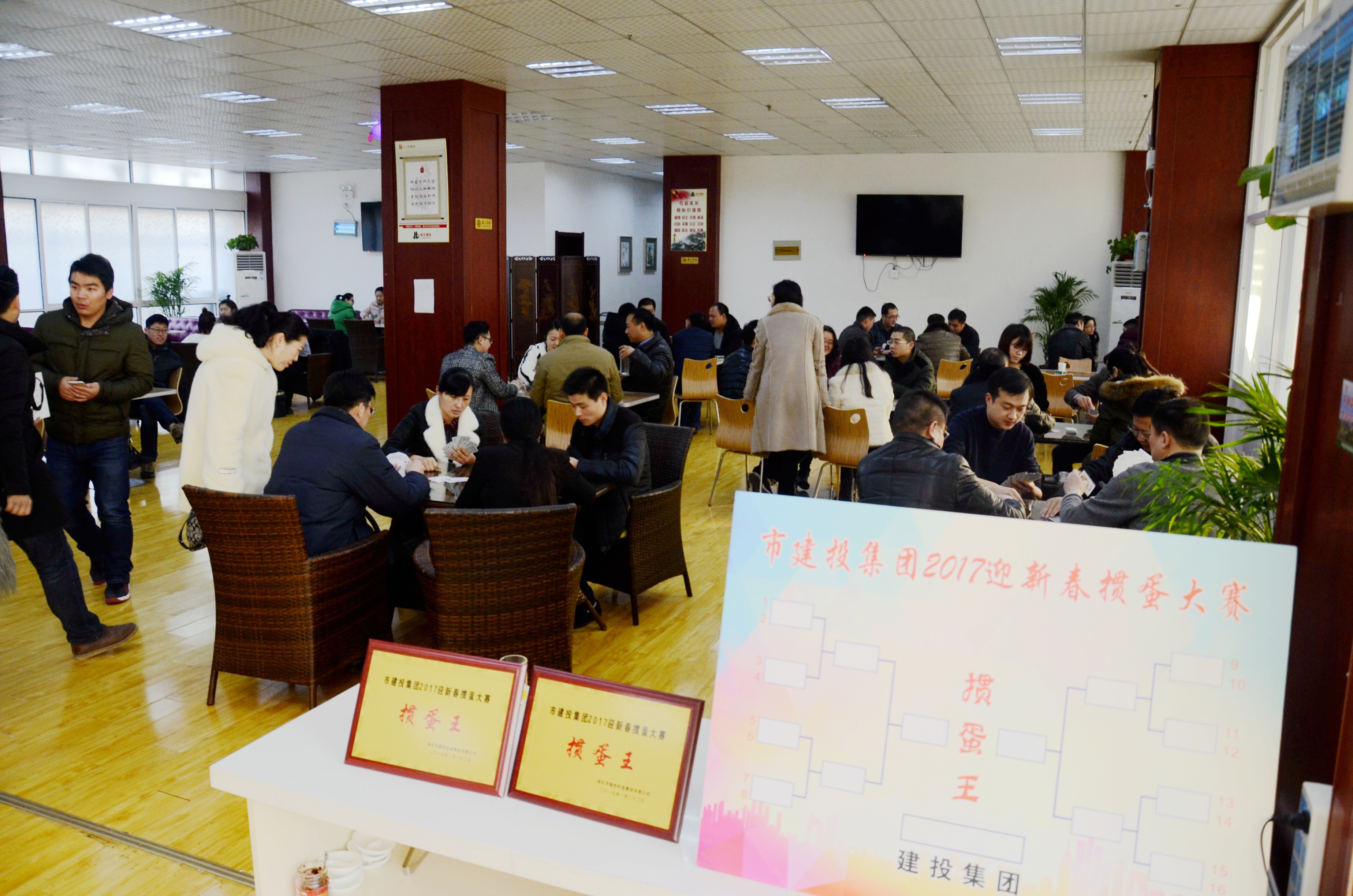 為迎接2017年春節(jié)的到來,豐富廣大員工業(yè)余文化生活,1月22日上午,市建投集團在公司食堂舉辦2017迎新春撲克牌(摜蛋)比賽,共有32組64位員工參加了比賽。
