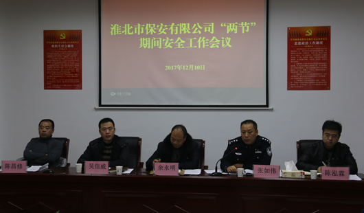 2017年12月10日晚,淮北市保安有限公司在六樓會(huì)議室召開“兩節(jié)”期間安全工作會(huì)議和講服務(wù)、轉(zhuǎn)作風(fēng)專項(xiàng)整頓活動(dòng)啟動(dòng)儀式,公司領(lǐng)導(dǎo)班子成員及市監(jiān)管支隊(duì)政委張如偉同志出席會(huì)議。