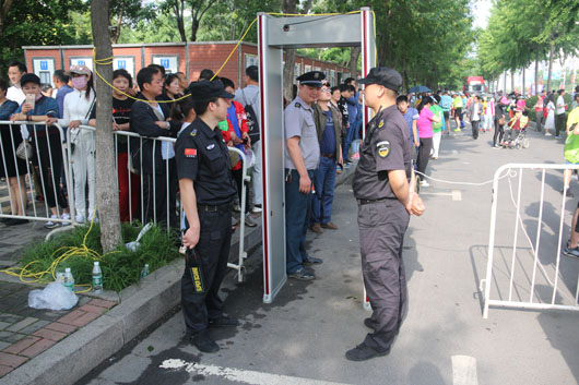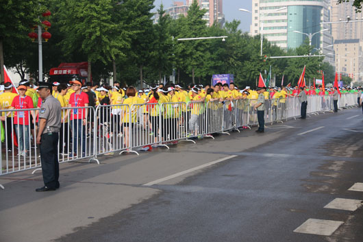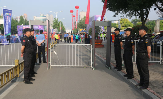 13日凌晨5:30分,負(fù)責(zé)市府廣場(chǎng)周邊區(qū)域的安保人員全部到崗。運(yùn)動(dòng)員入口安全檢查、重要部位值守、秩序維持、車(chē)輛指引、賽道沿線封閉防控等安保工作有序進(jìn)行。