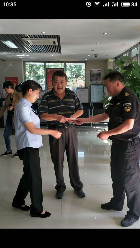 2018年9月28日17:10分,淮北市保安有限公司派駐淮北徽商銀行押運四中隊78號車組在濉溪徽商銀行虎山路支行執(zhí)行接款任務警戒時,車組長劉云寺在網點門口撿到現金700元。任務結束后立刻上交到中隊,中隊管理人員及時聯系徽商銀行保衛(wèi)科,通過調取銀行監(jiān)控錄像尋找失主。29日上午10:35分,中隊管理人員將700元現金交到失主手中,當事人非常高興并由衷地表示感謝!