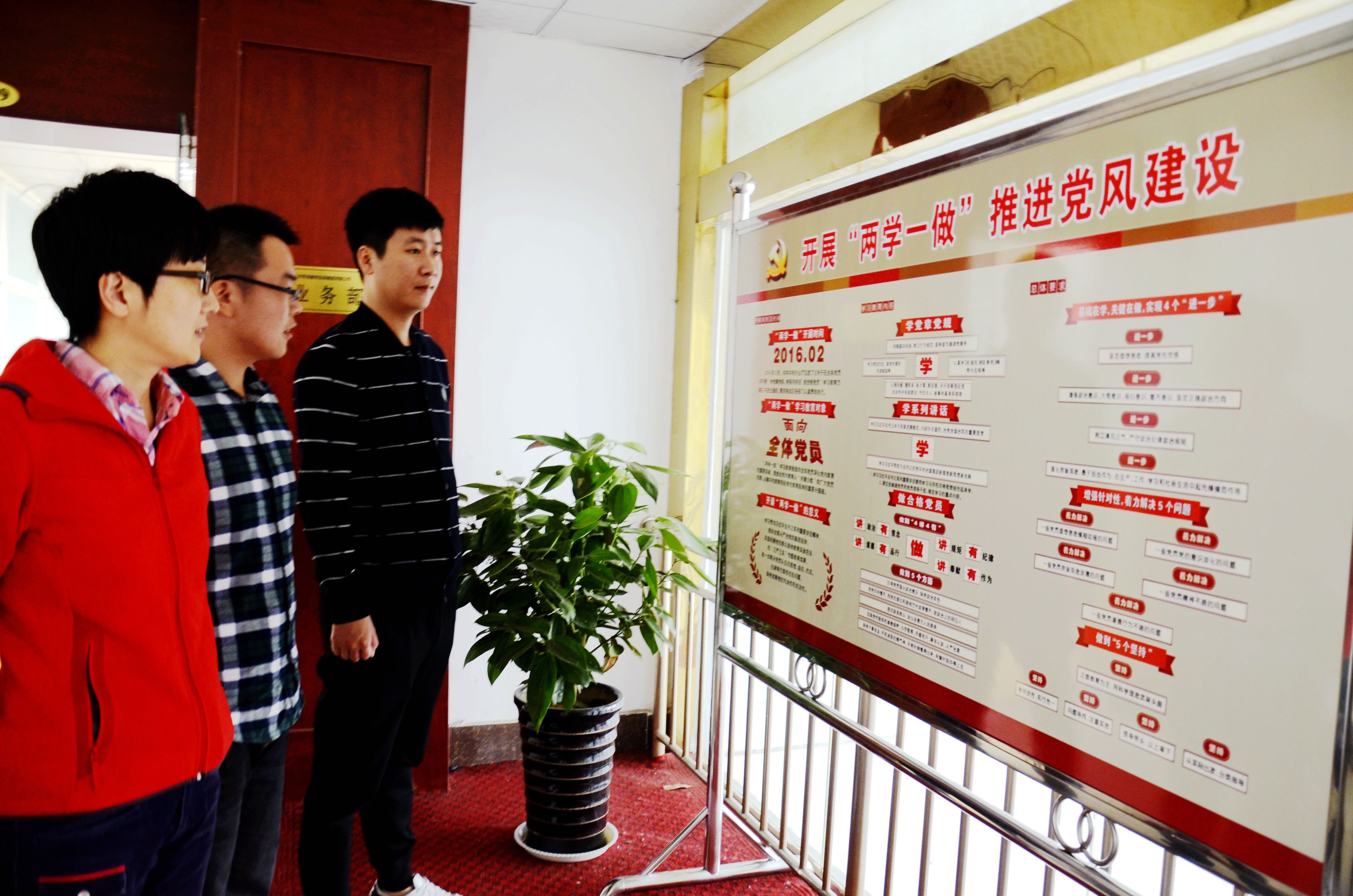 圖為同創(chuàng)集團、交投公司、保安公司的 員工在觀看 兩學一做學習教育展板。