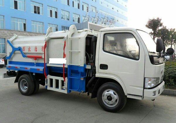 b.車(chē)上配置:有效裝載容積5立方,箱體采用邊三底四碳鋼板制作,箱體前部側(cè)面帶有掛桶提升機(jī)構(gòu),可自動(dòng)舉升垃圾桶倒入垃圾,帶自卸功能,尾部裝有橡膠密封條,防污水滴漏。
