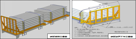 1. 運輸過程中,因滿載構(gòu)件貨車的慣性巨大,故構(gòu)件捆綁、貨車行駛速度、安全限位擋塊等安全措施,要求如下: