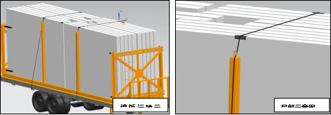 a. 墻板運輸,必需使用直徑不小于8.7天然纖維芯鋼絲繩或3.5T手動葫蘆,將運輸架與車架載重平板綁緊,且前端與后端至少兩根,鋼絲繩與構(gòu)件接觸部位需用護角保護;